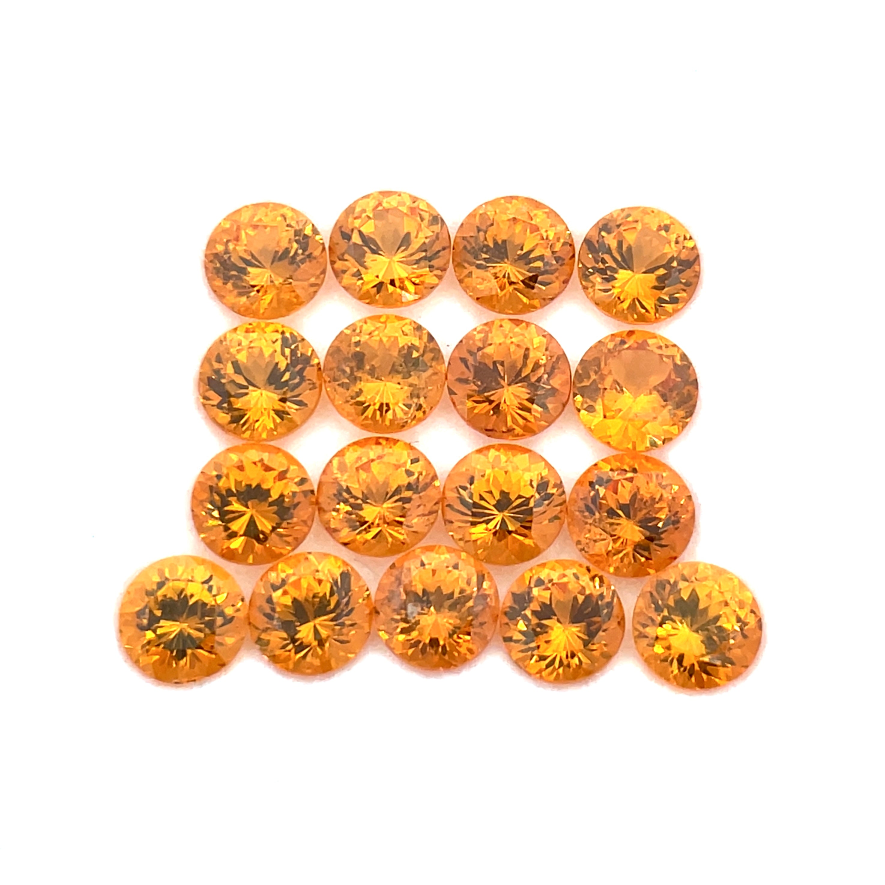 An impressive collection of seventeen natural Spessartite garnets weighing 4.04 carats in total, sourced directly from Nigeria's esteemed gemstone regions. Each round faceted stone measures 3.6mm and radiates the luminous Fanta orange hue prized by gemstone connoisseurs worldwide. Averaging approximately 0.24 carats per piece, these gems demonstrate exceptional uniformity in dimensions, color saturation, and cutting quality. The meticulous faceting enhances their inherent fire and brilliance, revealing the gemstone's characteristic warmth and depth. A substantial parcel perfect for ambitious jewelry commissions, curated collections, or those seeking authentic natural gemstones of distinguished provenance and refined elegance.
