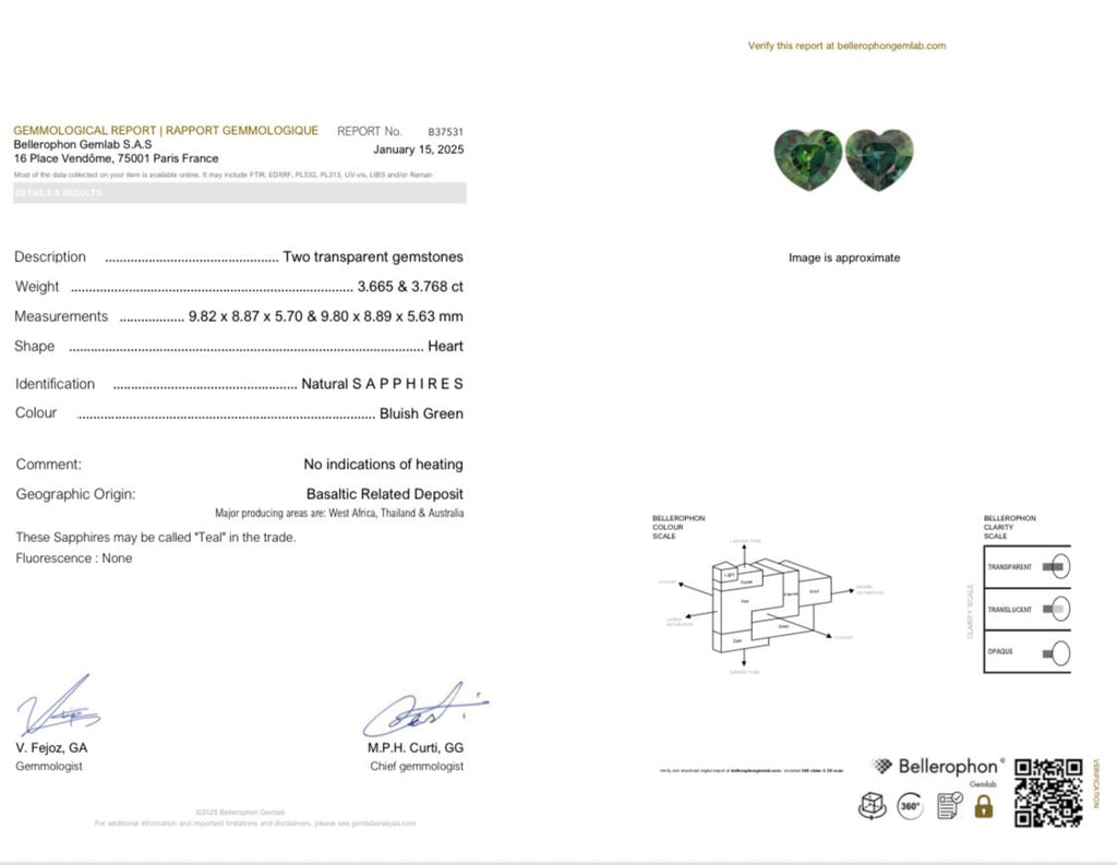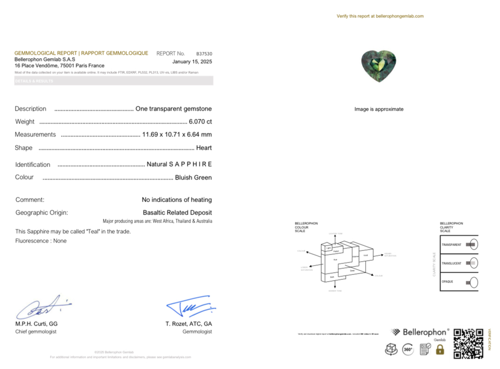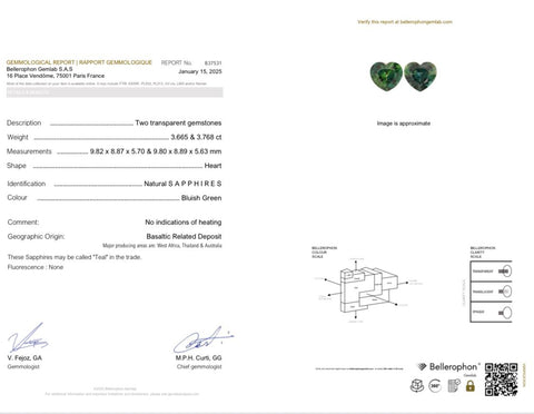 Discover the exquisite 13.50-carat natural teal sapphire, expertly faceted into a captivating heart shape. This unheated gem, certified by Bellerophon, showcases a unique teal hue with slight inclusions that enhance its natural beauty. Measuring approximately 9.8 x 8.8 x 5.7 mm, it offers a rare combination of elegance and authenticity, perfect for refined jewelry designs that celebrate genuine, untreated gemstones.