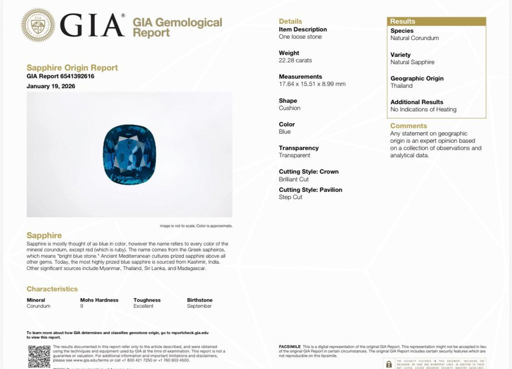 This exceptional 22.28-carat natural blue sapphire showcases the timeless elegance of Thai gemstones. Cut in a sophisticated cushion shape with precise faceting, the stone measures 17.6 x 15.5 x 8.9 mm and displays a captivating blue hue. With slightly included clarity and completely unheated, this sapphire retains its authentic character and natural beauty. A stunning choice for fine jewelry collectors and custom designs
