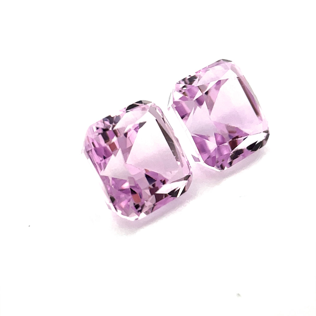 A captivating 15.49-carat natural kunzite pair featuring two exquisitely matched square octagon stones in luminous light pink. Harvested from Pakistan's distinguished gemstone regions and presented entirely untreated, these stones measure 10.5 x 10.5 x 8.6 mm each, balancing visual impact with refined proportions. Their slightly included clarity reflects the authentic essence of natural gemstones. The geometric square octagon faceting enhances brilliance while maintaining classical sophistication. An excellent choice for statement jewelry or coordinated designs, this pairing delivers genuine quality and timeless appeal for the discerning gemstone connoisseur.