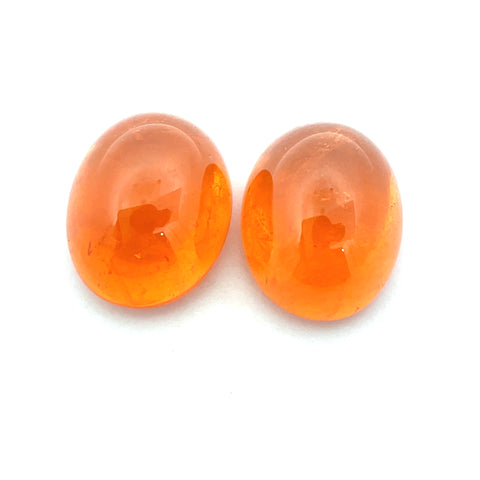 This pair of natural Fanta Spessartite Garnet cabochons, totaling 21.82 carats, showcases elegant oval shapes with a vibrant orange hue. Each gem measures approximately 13.1 x 10.4 x 7.0 mm and features semi-opaque clarity. Unheated and untreated, these stones retain their authentic beauty, making them an exceptional choice for sophisticated and timeless jewelry creations.