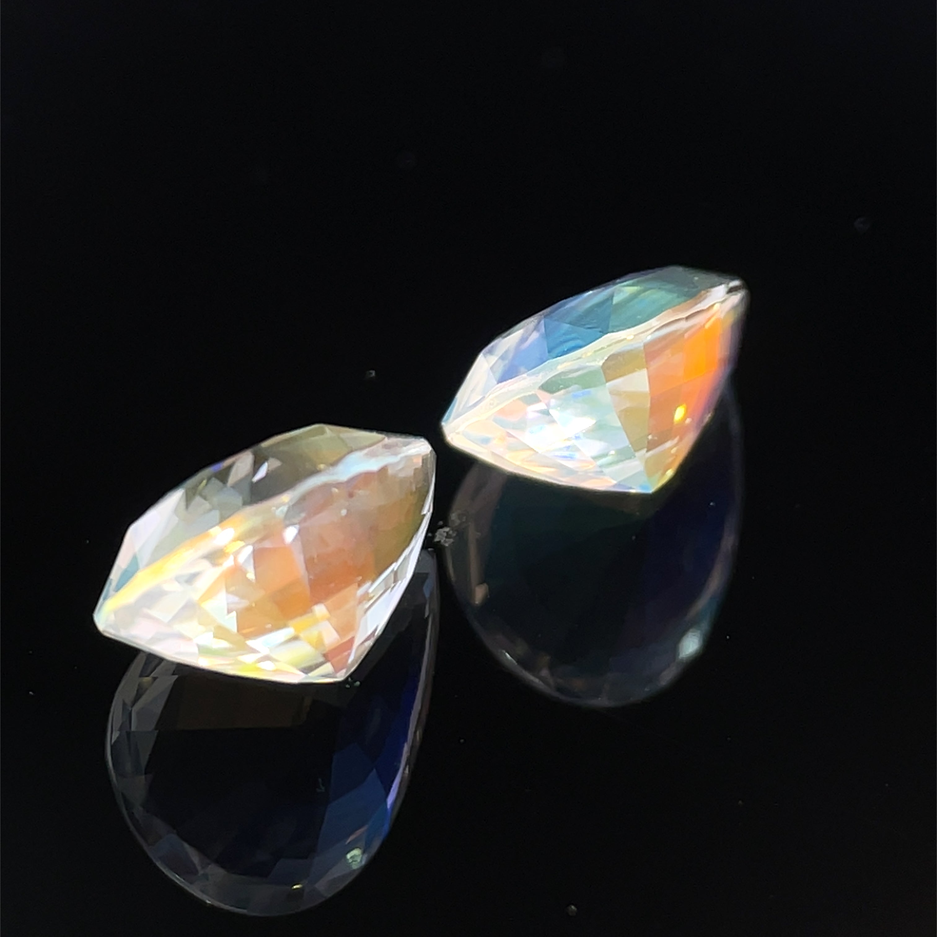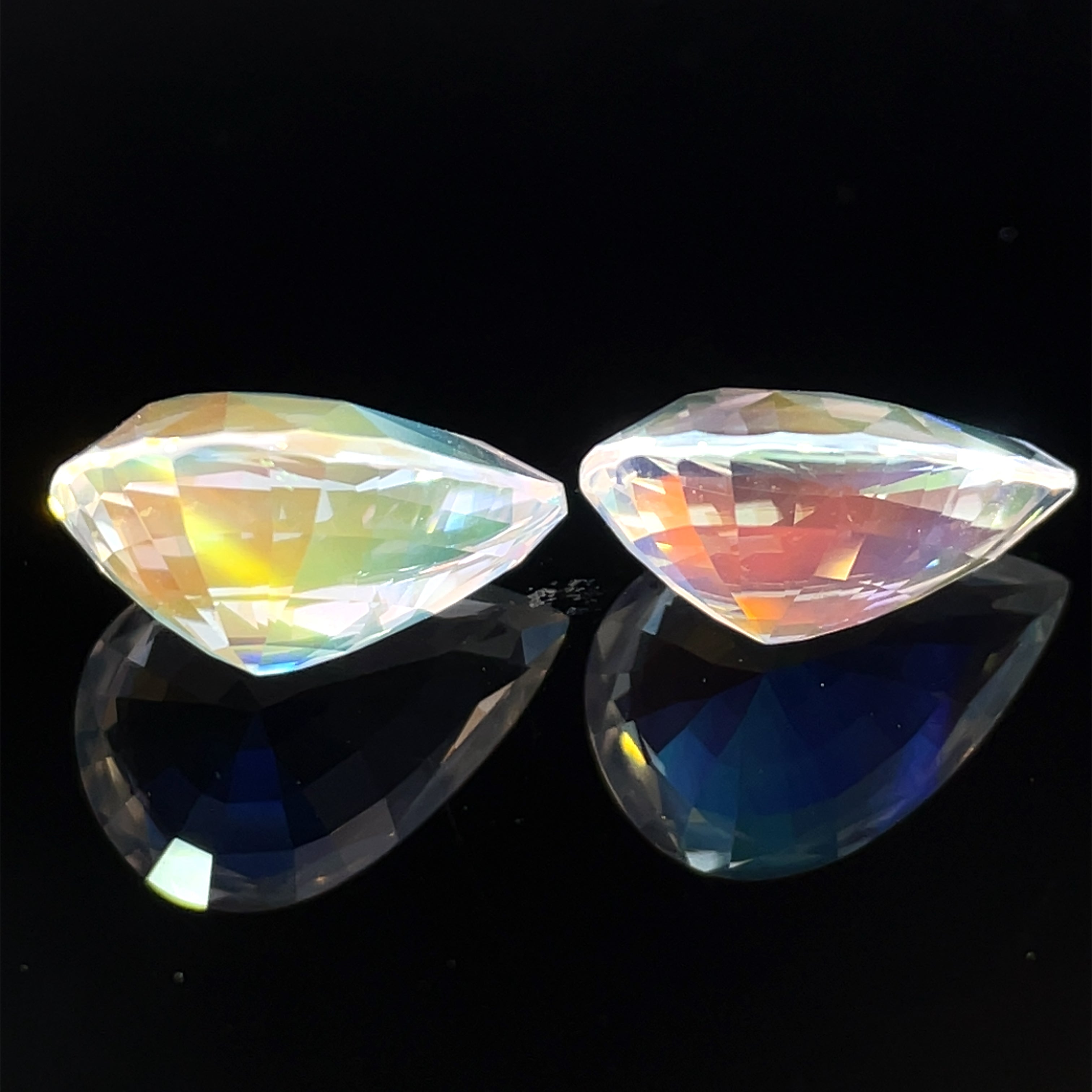 Elevate your jewelry collection with this stunning natural rainbow moonstone gemstone pair, totaling 8.94 carats of pure radiance. These eye-clean pear-shaped stones from Madagascar display captivating iridescent flashes across their faceted surfaces, untreated and authentically beautiful. Measuring 13.9 x 9.5 x 6.4 mm and 14.0 x 9.6 x 7.1 mm, this matched pair offers exceptional clarity and luminous depth. Ideal for bespoke jewelry creations, these gems embody natural elegance and refined craftsmanship.