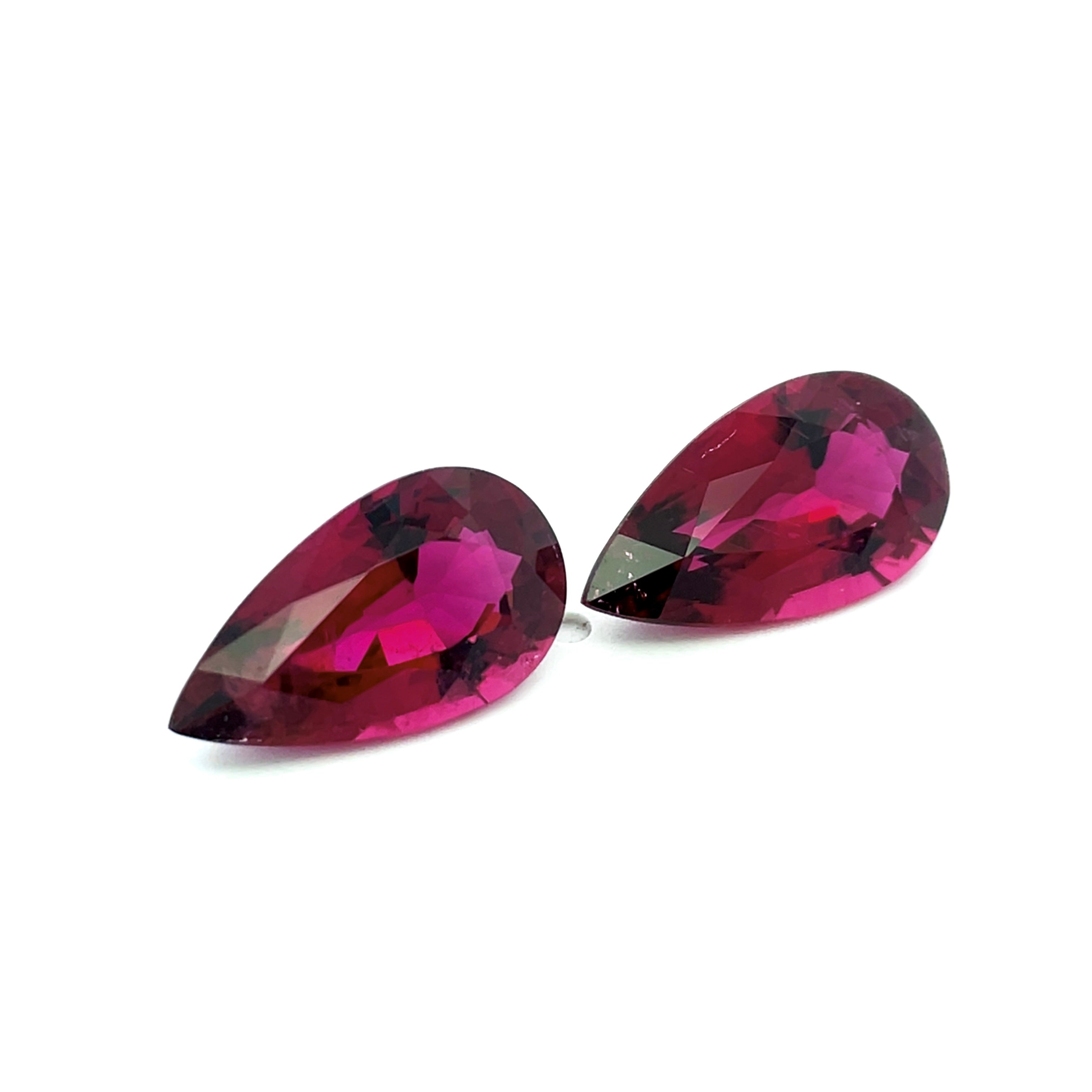 This exquisite pair of natural Rubellite Tourmaline gemstones, weighing 6.70 carats in total, features a refined pear shape with faceted cuts that enhance their purplish-red brilliance. Originating from Mozambique, these stones are untreated, showcasing their genuine beauty with slight inclusions that add character. Perfect for elegant jewelry designs, they offer a sophisticated touch with vibrant color and timeless appeal.