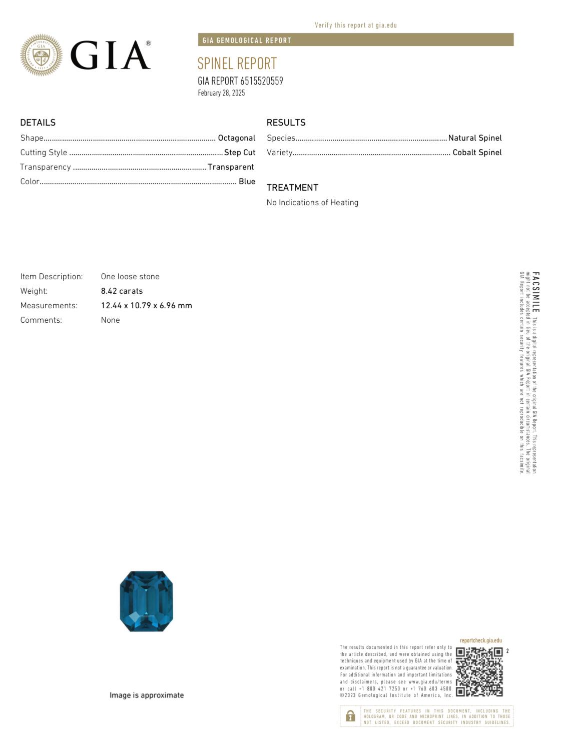 Discover the exquisite 8.42-carat natural cobalt spinel, expertly faceted into a refined octagon shape. This Tanzanian gem showcases a captivating blue hue with slight inclusions that add character without compromising its brilliance. Untreated and certified by GIA, it offers a rare combination of natural beauty and authenticity, perfect for collectors and connoisseurs seeking a sophisticated statement piece.