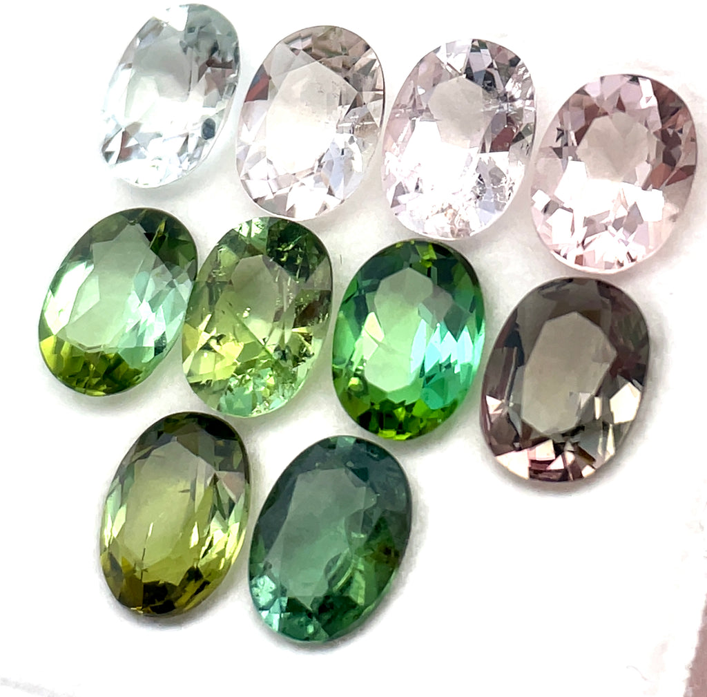 This refined collection features 10 natural multi-color tourmaline gemstones totaling 11.29 carats. Each faceted oval measures 8x6mm and boasts a harmonious blend of green, pink, white, and peach shades. Originating from Africa, these stones embody sophisticated elegance, perfect for creating standout, elegant jewelry pieces.