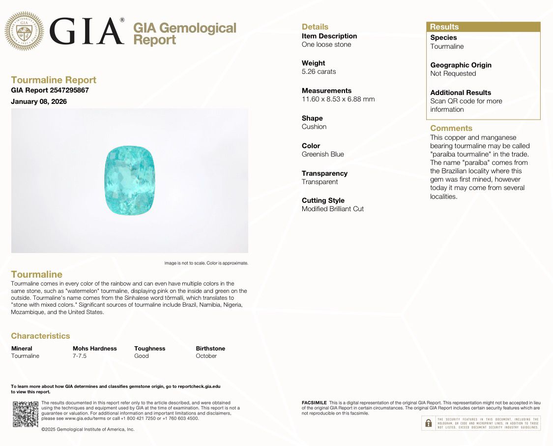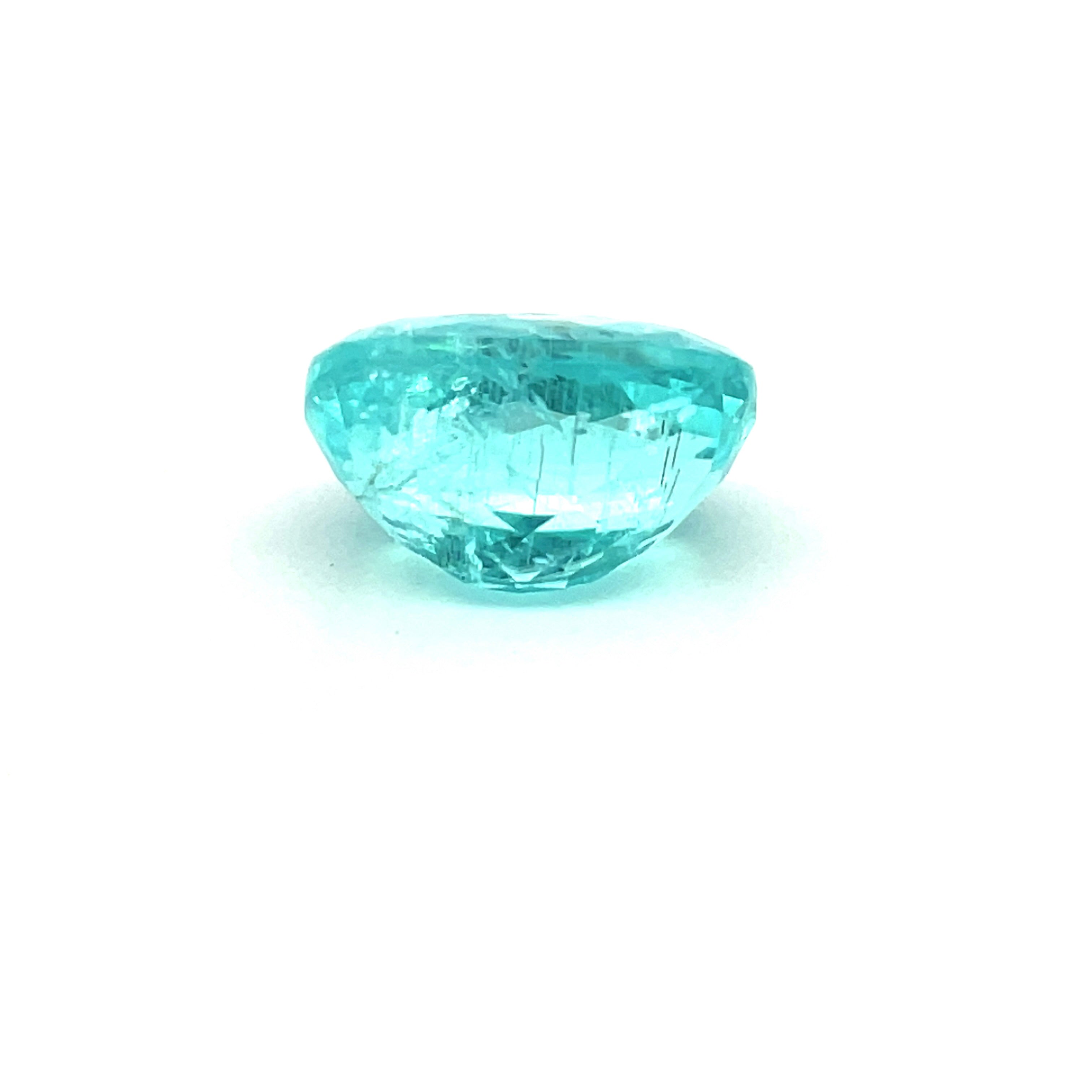 This stunning 5.26-carat Paraiba Tourmaline showcases a captivating greenish-blue hue that captures light beautifully. The oval faceted cut measures 11.6 x 8.5 x 6.9 mm, offering excellent presence and brilliance. Natural tourmaline with visible inclusions and heat treatment. A remarkable gemstone for collectors and jewelry enthusiasts seeking authentic Paraiba character and vibrant color saturation.