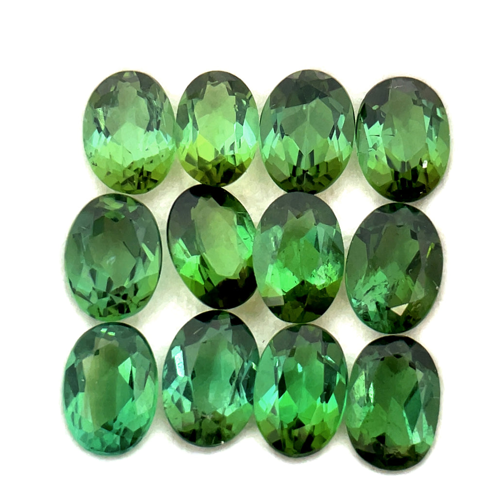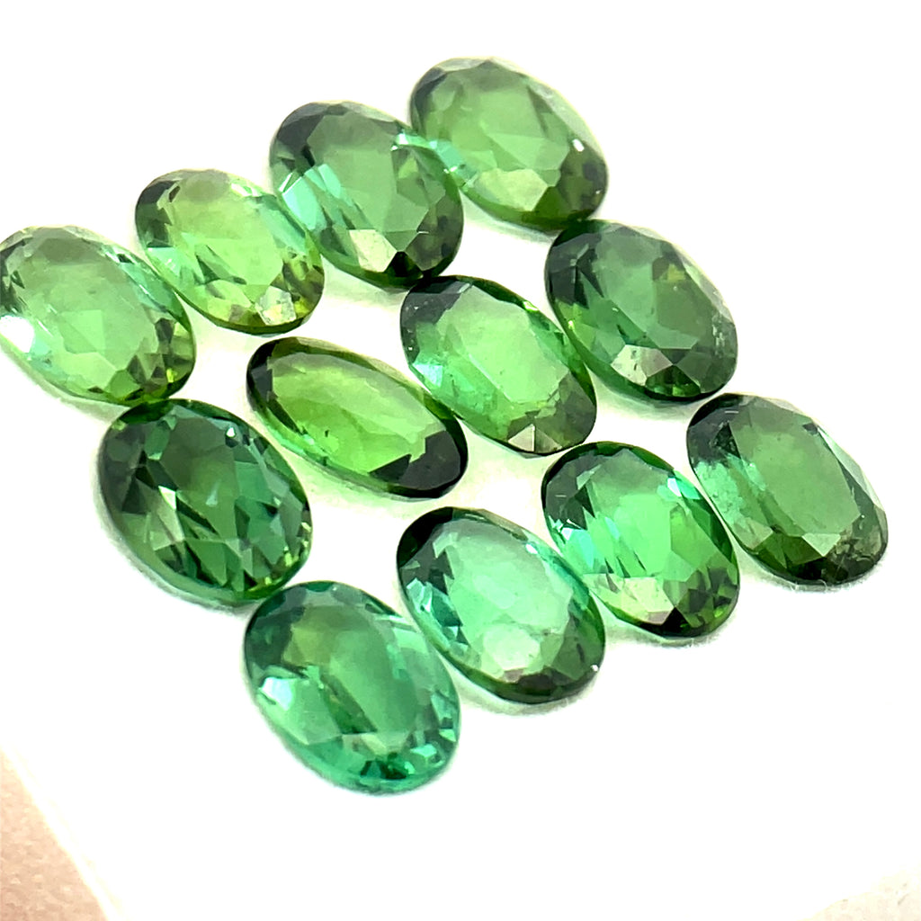 An impressive collection of twelve natural green tourmalines sourced from Africa's most esteemed gemstone regions. Each stone presents a refined oval silhouette measuring 7 x 5 mm, expertly faceted to enhance its inherent radiance and chromatic depth. This 9.00-carat parcel comprises entirely natural specimens—never heated or chemically treated—preserving their authentic mineral composition and geological significance. The remarkable uniformity in dimensions and vibrant green coloration throughout all twelve pieces makes this lot exceptionally suited for ambitious jewelry designs requiring substantial quantities of matched gemstones. An ideal selection for master craftspeople and serious collectors who demand uncompromised authenticity and superior quality in their gemstone acquisitions.