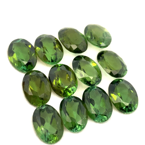 Discover this distinguished parcel of twelve natural green tourmalines, each precisely cut to 7 x 5 mm in a refined oval silhouette. Totaling 9.78 carats, these African-sourced gemstones exemplify pristine quality, having undergone no heat treatment or enhancement whatsoever. The faceted finish reveals the stone's inherent verdant radiance and crystalline clarity, rendering them exceptionally suitable for fine jewelry creation or serious gemstone collections. Each piece maintains its authentic character and natural integrity, offering the connoisseur a remarkable opportunity to acquire genuine, untreated tourmaline of considerable substance and beauty.