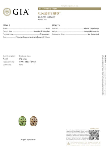 Discover the allure of this 5.42-carat natural Alexandrite gemstone, expertly faceted into an elegant oval shape. Celebrated for its remarkable color change from green to red, this gem showcases exceptional VS clarity with only very slight inclusions visible under magnification. Certified untreated and unheated, it reflects pure natural beauty, making it a rare and sophisticated addition to any fine jewelry collection.