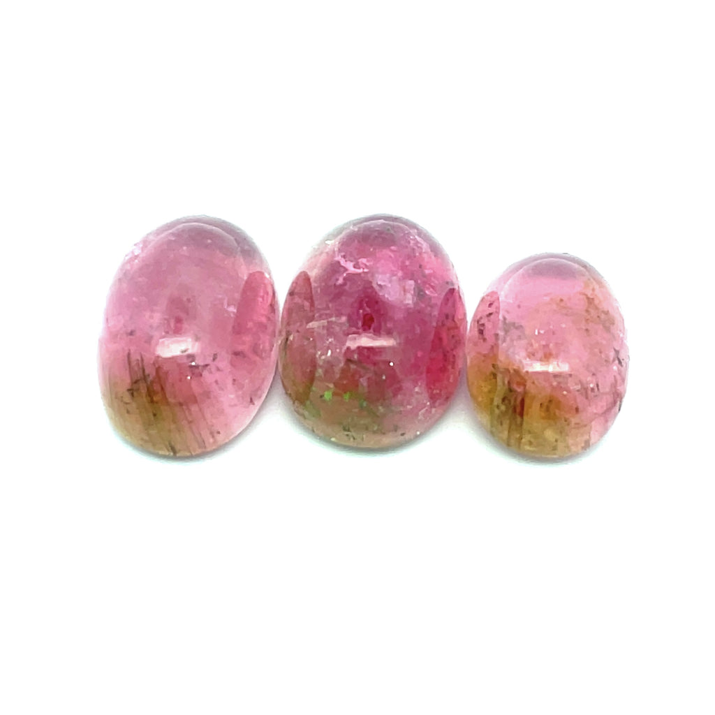 Reveal the captivating elegance of this set of three 22.88cts natural Bi-Color Tourmaline gemstones, meticulously crafted into oval cabochons. Originating from Africa, these untreated and unheated stones highlight a stunning bi-color interplay, showcasing their genuine and unaltered beauty. Ideal for sophisticated collectors, their significant size and classic cut emphasize both authenticity and refined style.