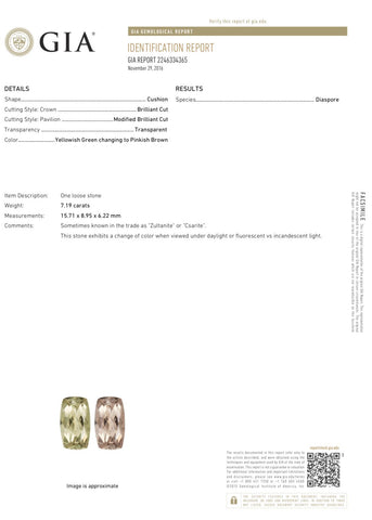 7.19cts GIA Natural Khaki Green Diaspore Color Change Gemstone- Cushion Shape - 21866RGT