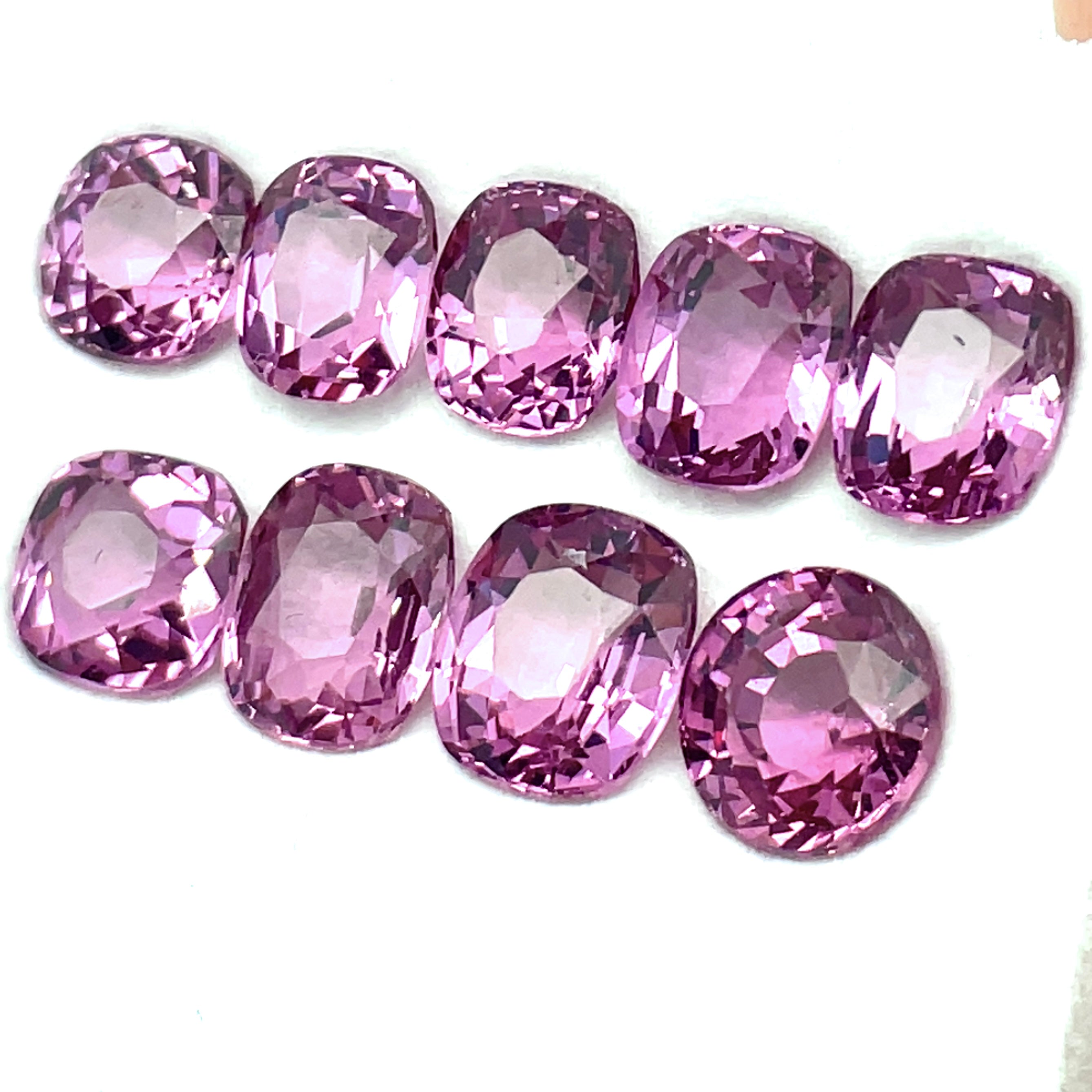 Discover the elegance of this 9-piece lot of Natural Malaya Garnet gemstones, totaling 12.54 carats. Each cushion-shaped stone features a mesmerizing blend of purple and pink hues, expertly faceted to reveal their vibrant depth. Perfect for refined jewelry designs, these garnets offer a unique balance of color and clarity, adding sophistication and charm to any collection.