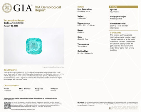 3.19cts GIA Natural Greenish Blue Paraiba Tourmaline Gemstone - Square Cushion Shape - 26301RGT