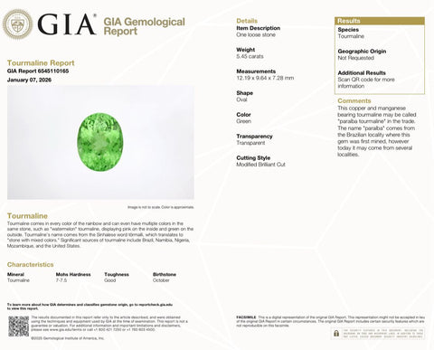 Behold the verdant elegance of this 5.45-carat natural Paraiba tourmaline, distinguished by its rich green coloration and timeless appeal. Precisely cut into an oval silhouette measuring 12.0 x 9.6 x 7.3 mm, this faceted gemstone showcases remarkable clarity and luminous depth. The presence of visible inclusions authenticates its natural origin and adds to its distinctive character. Refined through thermal treatment to enhance its saturated green tone, this tourmaline stands as a testament to nature's artistry and represents an exceptional selection for the discerning gemstone enthusiast seeking both rarity and refined beauty.