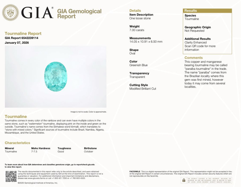 Discover the allure of this magnificent 7.00-carat natural Paraiba tourmaline, prized for its mesmerizing greenish-blue coloration. Expertly faceted into an elegant oval form measuring 14.0 x 10.8 x 5.5 mm, this gemstone delivers remarkable luminosity and depth. The stone's visible inclusions are a hallmark of authentic Paraiba specimens, while clarity enhancement has been applied to optimize its visual appeal. A sophisticated choice for discerning collectors, this tourmaline combines rarity, natural beauty, and refined craftsmanship in a single, captivating gemstone.