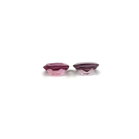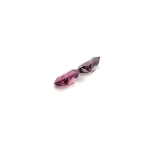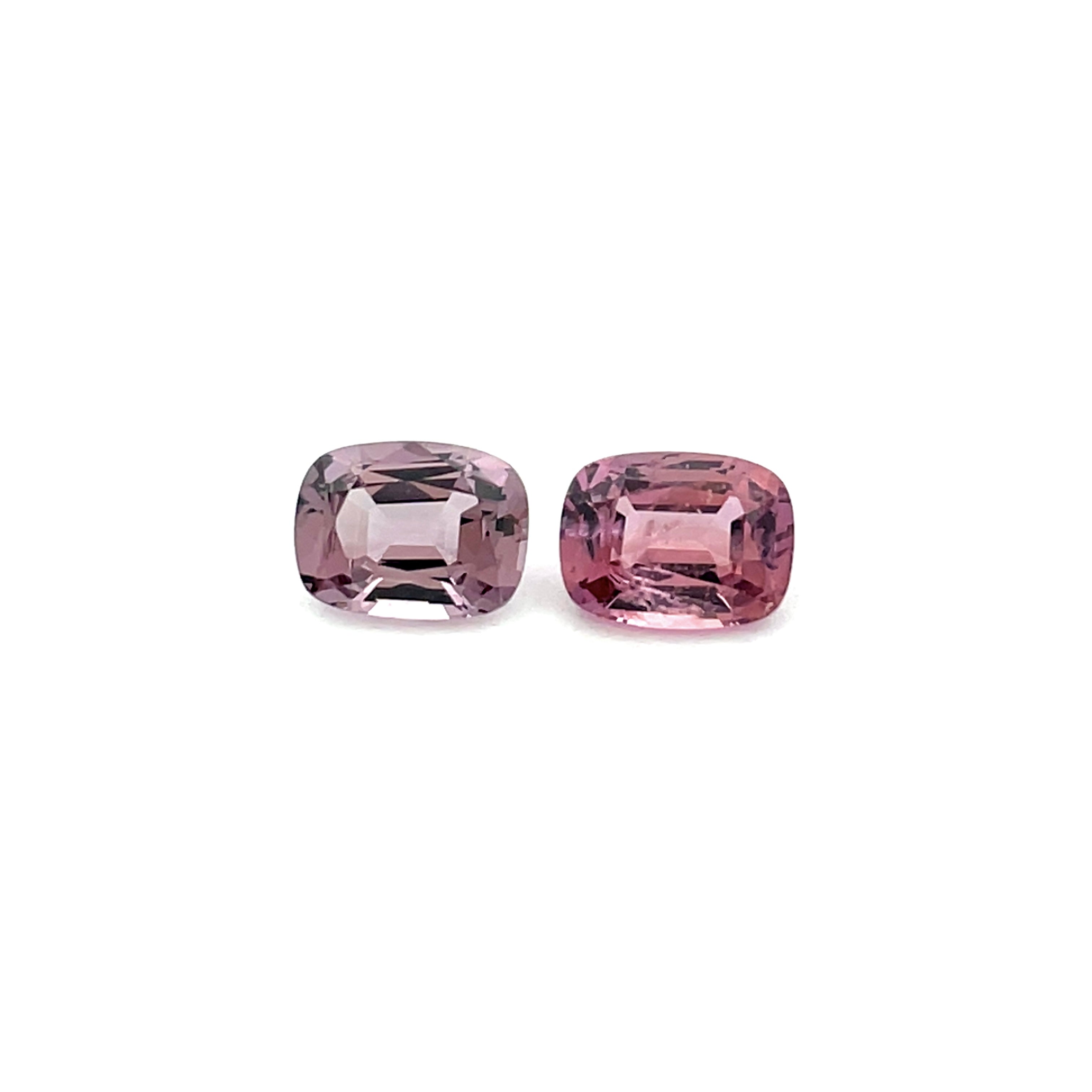 This 0.95-carat pair of natural Burma spinel gemstones features a delicate cushion shape with expert faceting. Their subtle blend of purple and pink hues, combined with slight inclusions, highlights their authentic origin and untreated nature. These stones offer a refined and elegant option for sophisticated jewelry designs.
