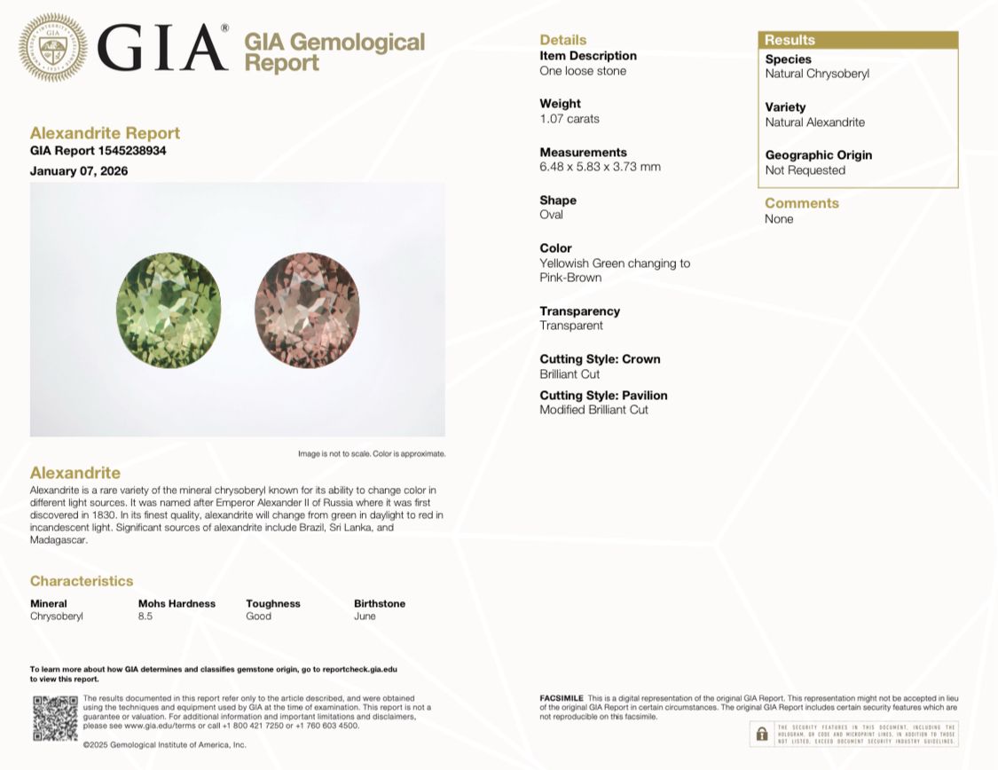 Experience the captivating allure of this exceptional 1.07-carat natural alexandrite, renowned for its mesmerizing color-change phenomenon. This oval-cut gemstone transitions from yellowish green in daylight to enchanting pink-brown under incandescent light—a hallmark of premium alexandrite quality. Measuring 6.4 x 5.8 x 3.7 mm with VS clarity and flawless faceting, this unheated, untreated stone represents nature's rarest optical magic. Perfect for the discerning collector or bespoke jewelry creation, this certified gemstone embodies timeless elegance and investment-grade authenticity.