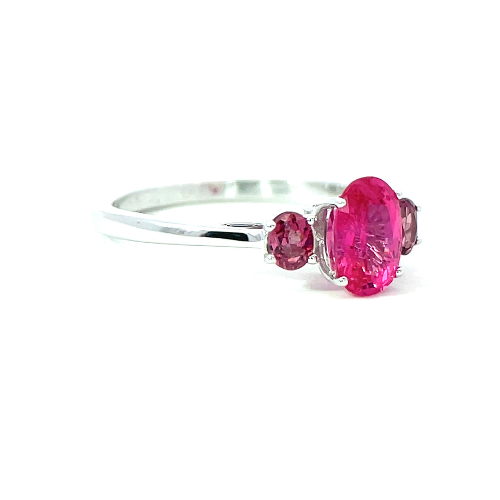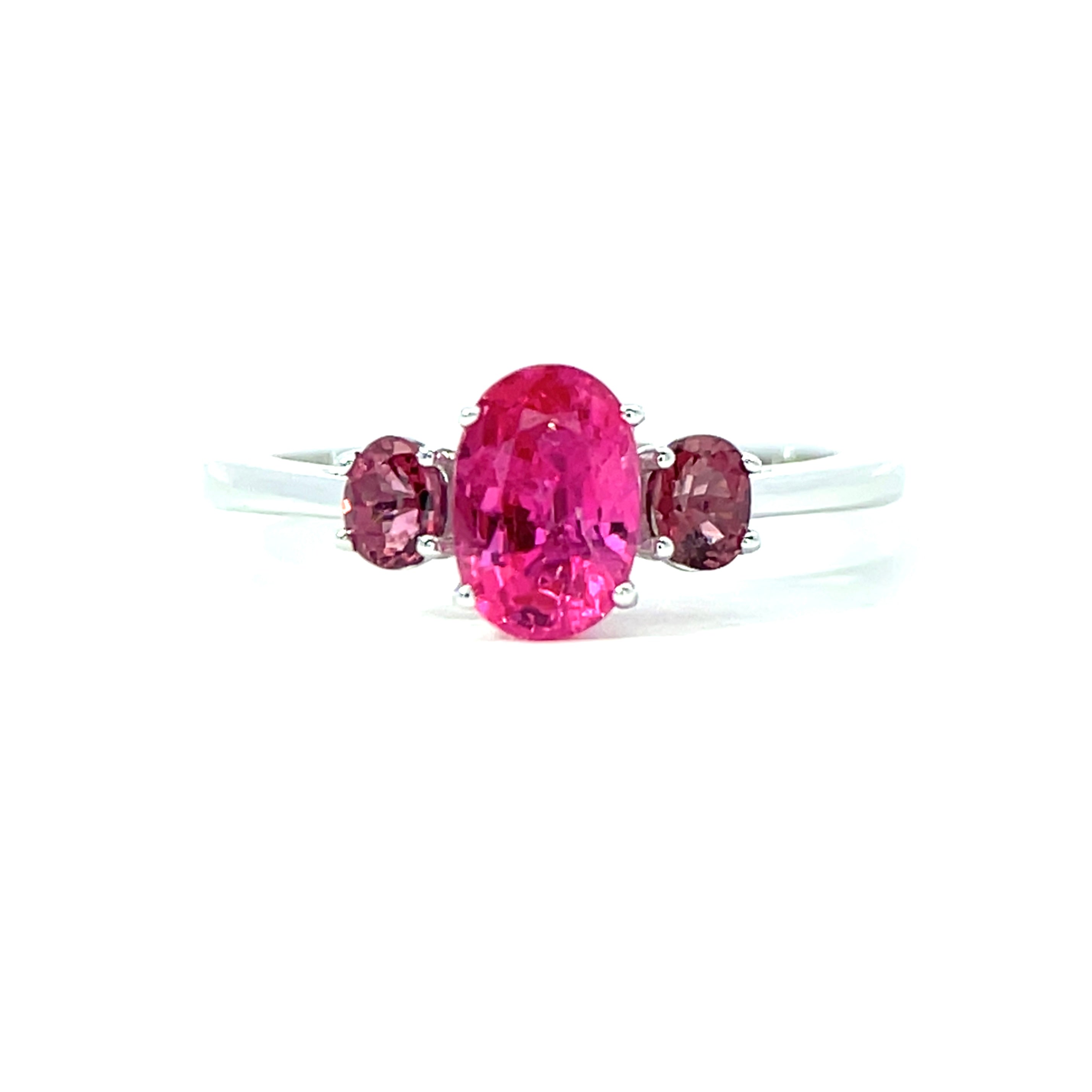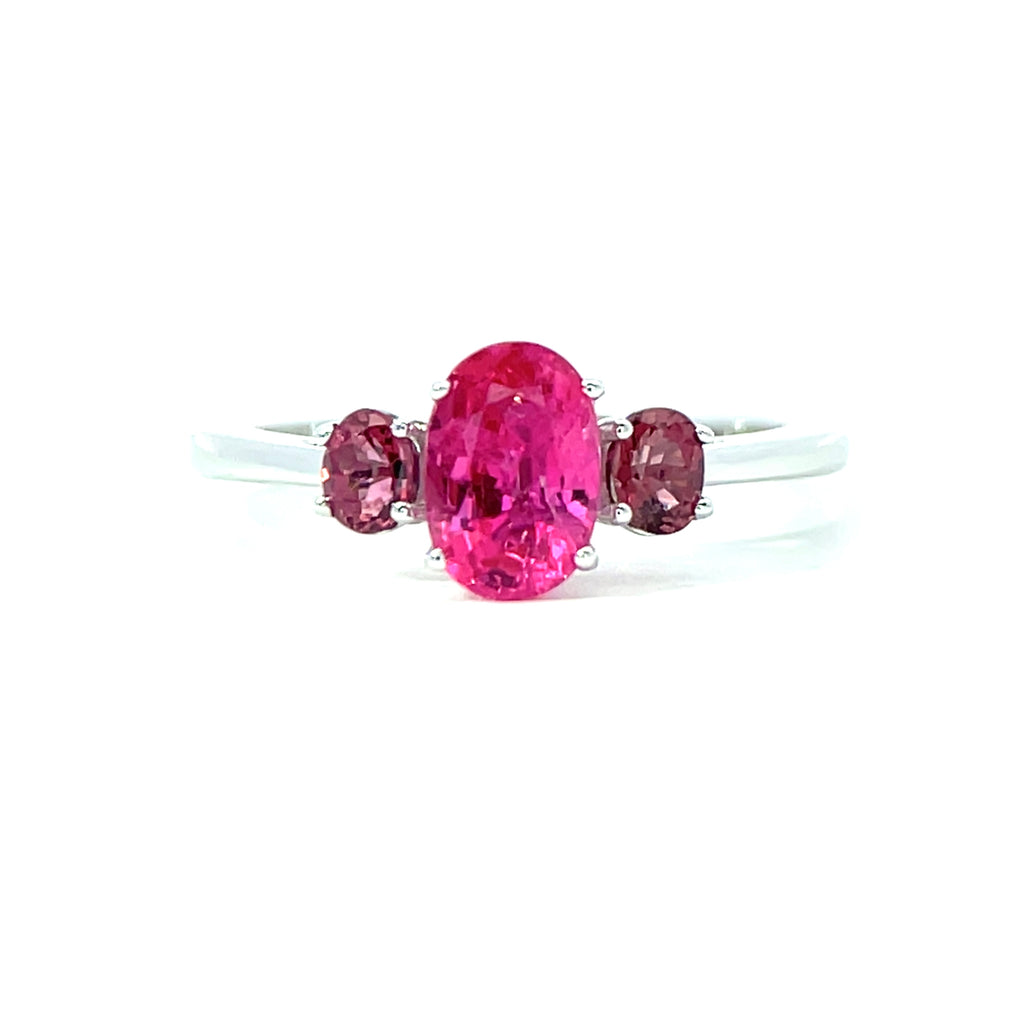 This exquisite engagement ring features an oval-shaped natural spinel center stone in a vivid pink hue, weighing 1.02cts and set in 18K white gold. The beautiful gem is complemented by 0.33cts of natural purplish spinel side stones, adding a touch of elegance to the ring. Perfect for anyone seeking a unique and colorful engagement ring.