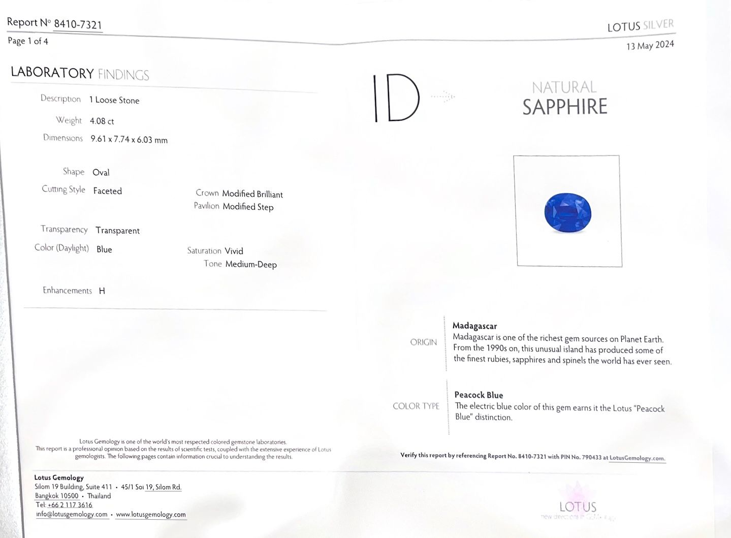 Experience the beauty and luxury of the 4.08cts Lotus Natural Gemstone Heated Peacock Blue Sapphire. This oval-shaped gemstone boasts a vibrant blue color with a faceted cutting style, adding dazzle to any jewelry piece. Sourced from Madagascar and treated to enhance its natural beauty, this certified sapphire is perfect for those who appreciate the finest things in life.