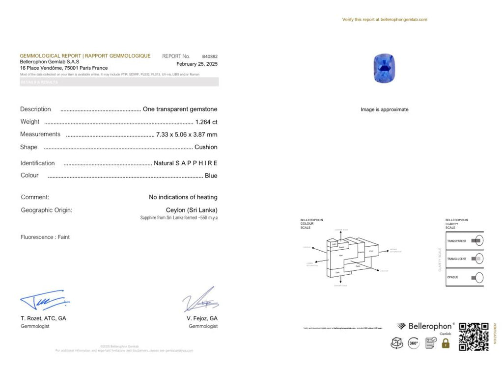 Experience the stunning beauty of this 1.26cts Bellerophon Natural Unheated Blue Sapphire Gemstone. Its cushion shape and faceted cutting style showcase its vibrant blue color and slight inclusions. Sourced from Sri Lanka and unheated, this gemstone is certified by Bellerophon, ensuring its natural and untreated state. Elevate your jewelry collection with this unique and ethically-sourced treasure.